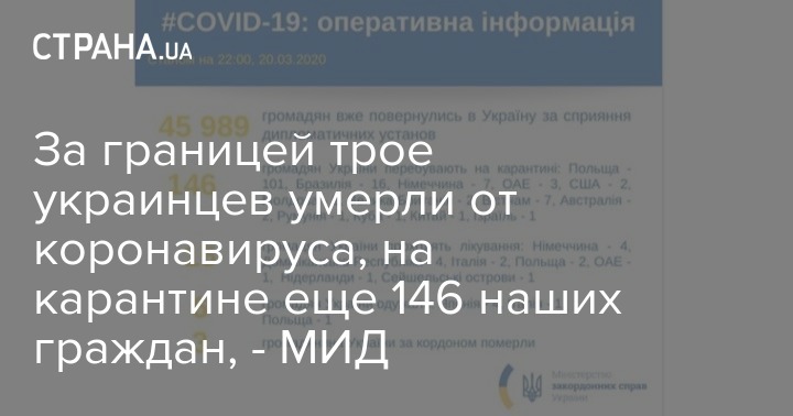 Трое наших земляков скончались, а на карантине за границей находятся 146 украинцев. Из них 101 - в Польше, 16 - в Бразилии, по 7 - в Германии и Вьетнаме, 3 - в ОАЭ, по 2 в США, Австралии, Молдове и Великобритании, по одному - в Румынии, на Кубе, в Китае и Израиле.