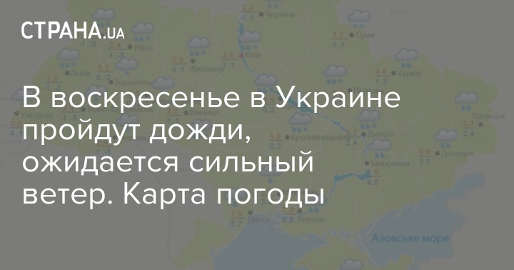 В воскресенье в Украине пройдут дожди, ожидается сильный ветер. Карта погоды