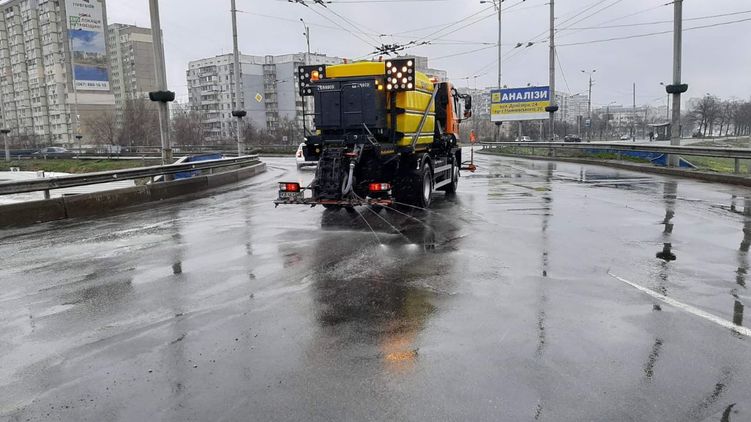 Снег в Киеве пошел 22 марта и дороги начали поливать антигололедным раствором. Фото: kyivcity.gov.ua