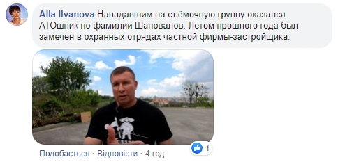 "Нападавшим на съёмочную группу оказался АТОшник по фамилии Шаповалов. Летом прошлого года был замечен в охранных отрядах частной фирмы-застройщика", - написала в ФБ Алла Иванова.