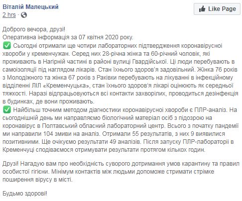 В Полтавской области еще два случая заболевания Covid-19, фото: facebook.com/vitalii.maletskyi.official