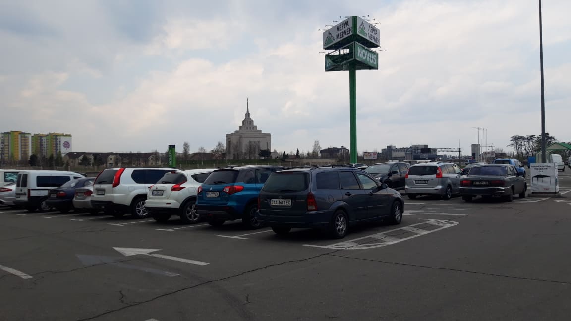 12:15 Очередь на входе в строительный гипермаркет Леруа Марлен в Киеве. Один выходит - один заходит.