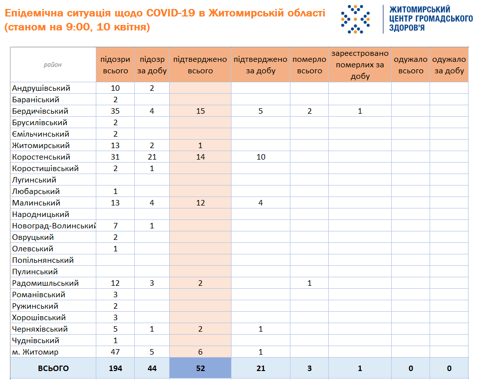 11:43 Житомирский Центр Общественного здоровья дает статистику 52 случая по области на 10 апреля (по данным МОЗ - 41). Больше всего заболевших в Бердичевском, Коростеньском и Малинском районах