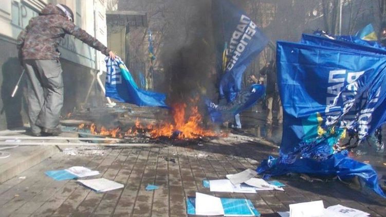 Несколько десятков радикалов в масках 18 февраля 2014 года забросали офис Партии регионов на улице Липской в Киеве камнями и "коктейлями Молотова", когда там находились люди.