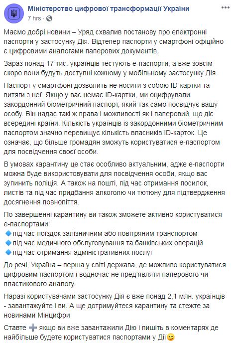 В условиях карантина это становится особенно актуальным, ведь е-паспорта можно будет использовать для удостоверения личности, если вас остановит полиция. Также он пригодится на почте (при получении посылок, писем) и при приобретении алкоголя или табака для подтверждения достижения совершеннолетия.