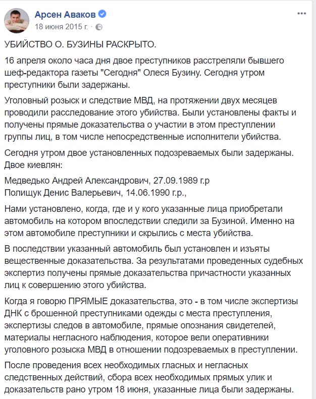 18 июня 2015 года глава МВД Арсен Аваков сообщил о раскрытии убийства и о задеражнии трех человек (в основном посте он указал двух и в комментариях добавил еще одного).