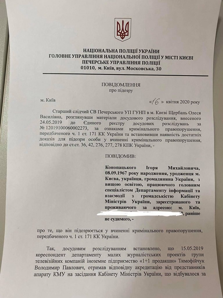 Представителю Кабмина, который препятствовал профессиональной деятельности журналистов, вручили подозрение в совершении преступления, на что понадобился целый год.