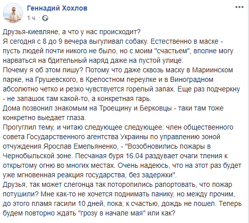 "Возобновился пожар в Чернобыльской зоне. Песчаная буря раздувает очаги тления на многих участках. Очень надеюсь, что на этот раз будет уже мгновенная реакция государства, без задержки. Тем более, что бюджеты на тушение выделены", - написал Емельяненко.
