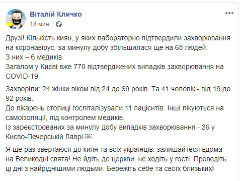 "Я еще раз обращаюсь к киевлянам и всех украинцам: оставайтесь дома на Пасхальные праздники! Не идите в церковь, не ходите в гости. Проведите эти дни с родными людьми. Берегите себя и своих близких!" - написал Кличко.