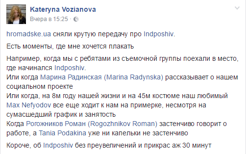 Она рассказывает, что Hromadske сняло про ее бренд "крутую передачу", и упомянула, что в сюжете есть момент с Нефедовым, который прикупил у Indposhiv уже 45 костюмов.