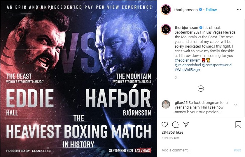 "Это официально. Сентябрь 2021 года в Лас-Вегасе, штат Невада, Гора против Зверя. Следующие полтора года моей карьеры будут посвящены исключительно этой борьбе. Я не могу дождаться, когда моя семья выйдет на ринг, когда я повергну Эдди Холла", - написал он.