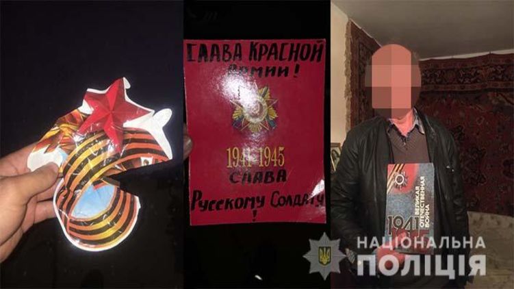 Отмечается, что пенсионер своими руками оформлял поздравительные открытки с помощью трафаретов, шаблонов и маркеров. На листовки мужчина наносил советские символы, запрещенные украинским законодательством, и лозунги "Слава Красной армии! Слава русскому солдату", затем расклеивал их в центре города.
