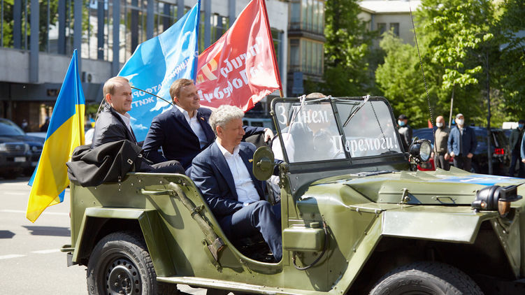 В Киеве автопробег провела "Оппозиционная платформа - "За жизнь".  Лидеры партии возложили цветы к Вечному огню в Киеве, а потом проехались в автомобиле военных лет и на площади Победы спели песню "День победы".