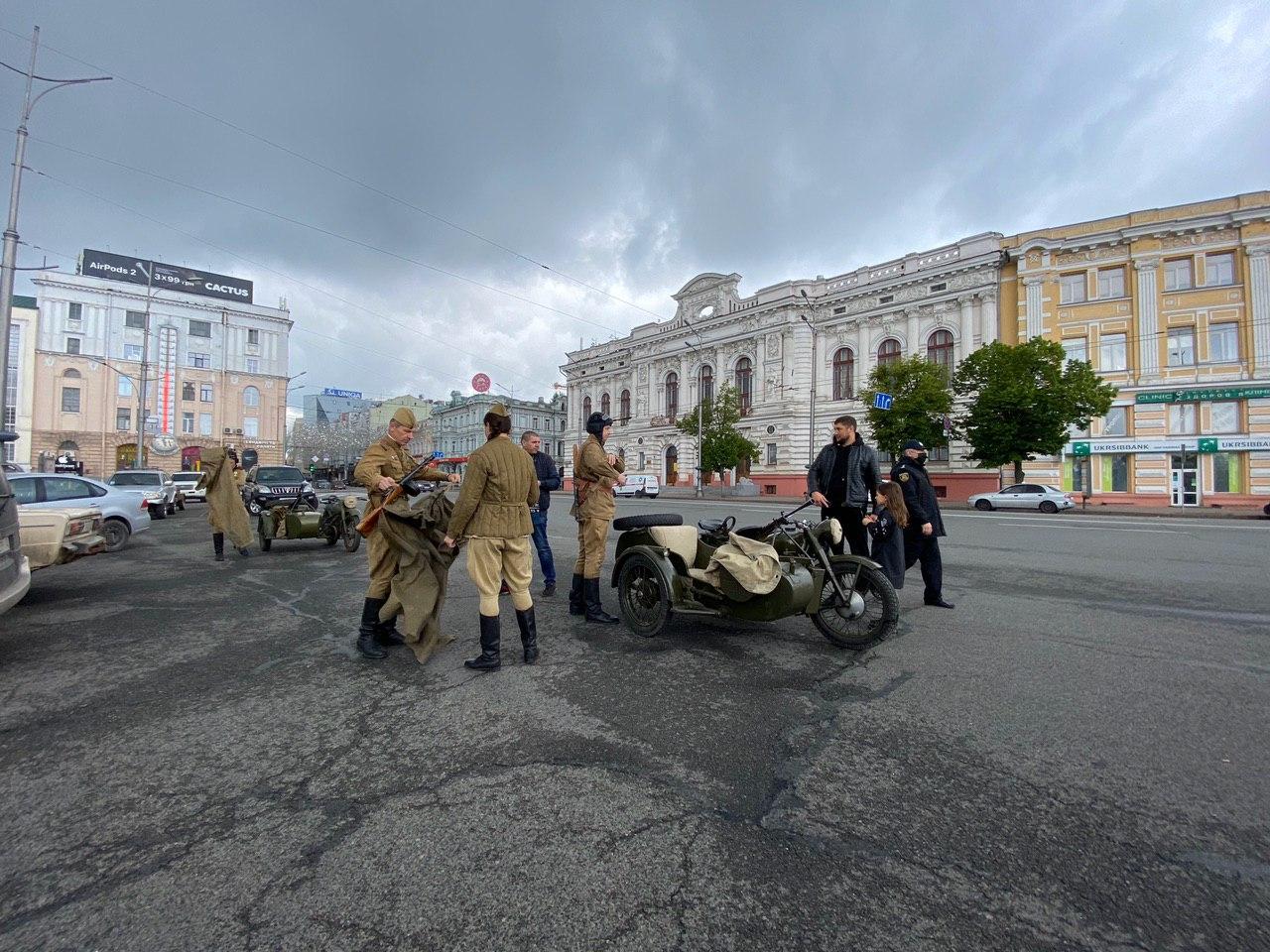 Судя по ним, в автопробеге приняли участие автомобили, стилизированные под военную технику тех лет, и харьковчане, одетые в форму военную форму бойцов Красной армии. Мероприятие проходило на одной из главных площадей города - на Площади Конституции.