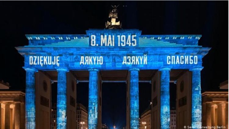 В Германии отмечают 75-ю годовщину окончания Второй мировой войны. По этому случаю Брандербургские ворота в Берлине были подсвечены словами благодарности воинам-освободителям на украинском, русском и еще пяти языках.