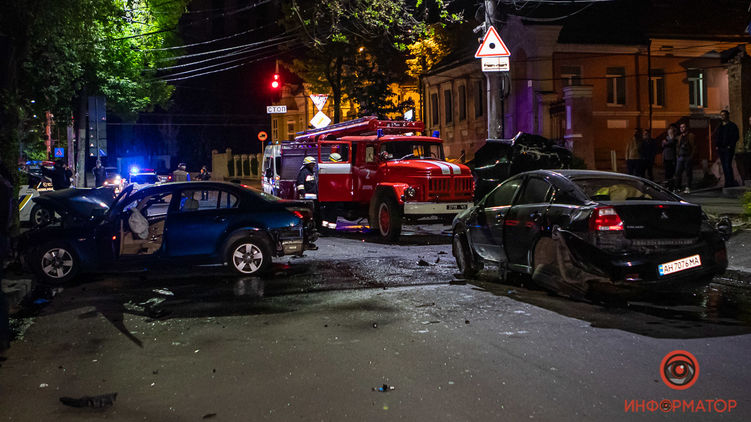 На опубликованных в соцсети кадрах видно, как автомобиль несется на огромной скорости по центру Днепра, а на перекрестке улиц Фабра и Старокозацкой он, вероятно, потеряв управление, вылетает на встречную полосу и таранит BMW, который ждет зеленого сигнала светофора. После столкновения Mitsubishi перевернулся, автомобили разбросало по всей проезжей части, движение на этом участке дороги оказалось заблокированным.