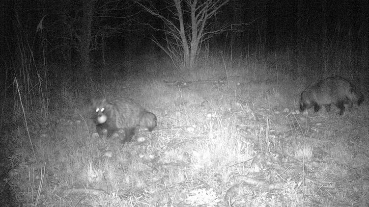 Поскольку енотовидная собака ведет преимущественно ночной образ жизни, зафиксировать его днем тяжело. Фотоловушка поймала зверьков ночью, когда они выбирали себе яблоки и морковь.