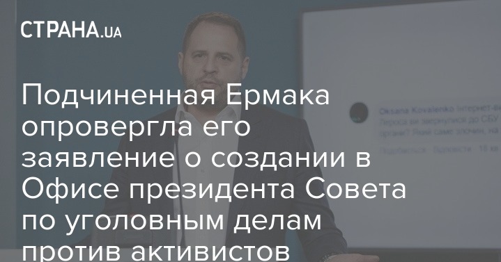 Глава Офиса президента Украины Андрей Ермак в начале мая публично заявлял, что при Офисе президента создадут общественный совет для обсуждения наиболее резонансных уголовных производств. Однако официально в самом Офисе Зеленского эту информацию опровергли, заявив про отсутствие документов о создании такого органа.