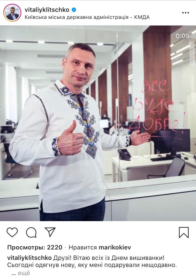 Мэр Киева Виталий Кличко провел в вышитой рубахе свой телебрифинг, посвященный ситуации с коронавирусом в столице. В соцсети Instagram он затем написал, что эту сорочку ему недавно подарили, и призвал уважать украинские традиции.
