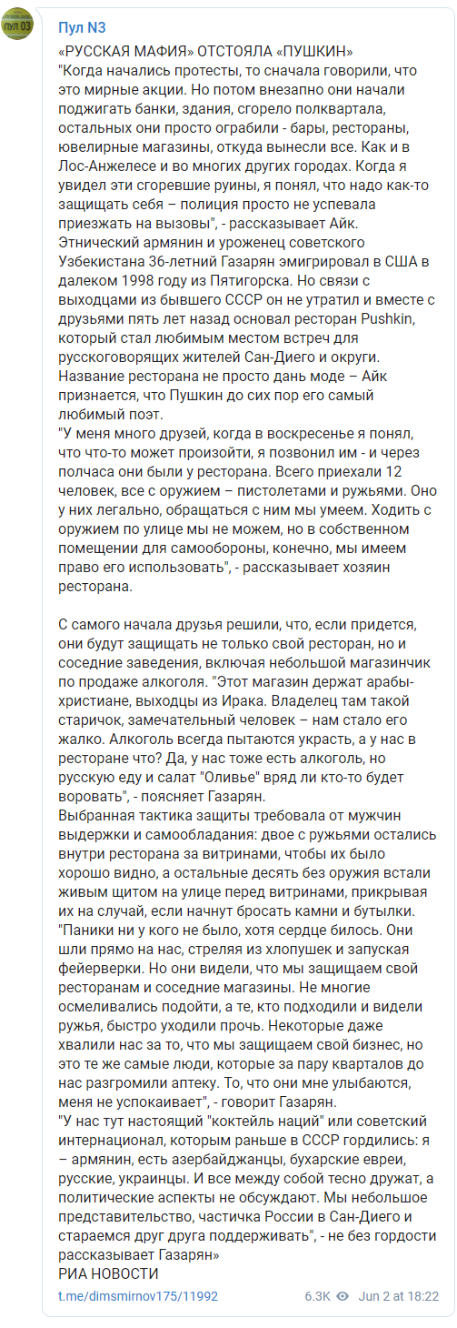 Владелец ресторана русской кухни Айк Газарян со своими друзьями принялся оборонять принадлежащий ему ресторан "Пушкин" в Сан-Диего от погромов, которые начались во время протестов в США против полицейского насилия. В соцсетях Айка и его товарищей прозвали "русской мафией".