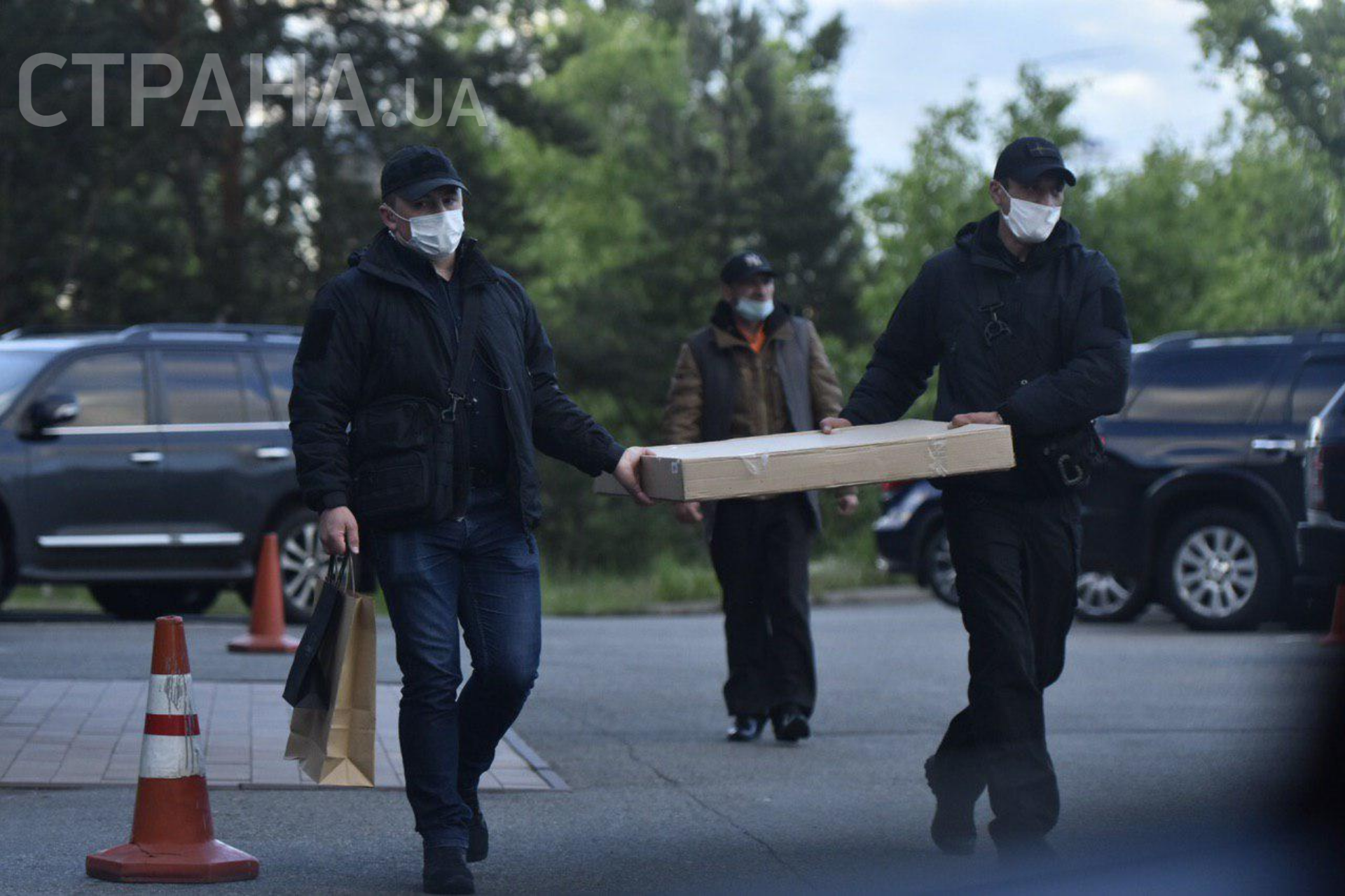 С большой коробкой, которую несет охранник, явился депутат из группы "За будущее" Дмитрий Лубинец.