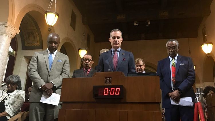 Мэр Лос-Анджелеса (в центре) переходит от слов к делу. Фото: Facebook/ MayorOfLA