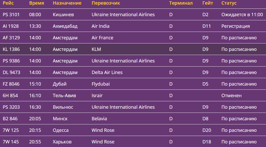 Внутренние рейсы выполнит компания Wind Rose - в Одессу (10:10, 20:15), Днепр (10:05) и Харьков (20:55). Также ожидается прибытие 3 рейсов из Амстердама, 3 рейсов из Минска, Дели, Дубая, Остенде, Тель-Авива, 2 из Днепра и Одессы.