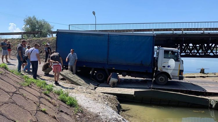 Под Никополем повреждена понтонная переправа, заменившая мост, который рухнул под тяжестью фуры прямо во время пресс-конференции президента Владимира Зеленского. На этот раз причиной инцидента тоже стал грузовик, под колесами которого обрушилась крайняя секция переправы. Об этом сообщается на странице OrdzhoCity в соцсети.