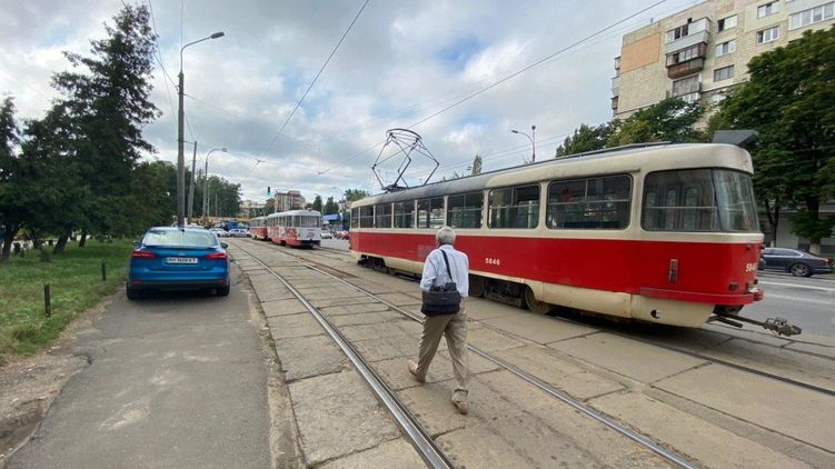 При этом кран уже около получаса стоит на пути у трамваев, проезд которых заблокирован как с Подола, так и по направлению к нему. Люди вынуждены выходить из транспорта и идти пешком, так как неизвестно, когда кран уберут с проезда.