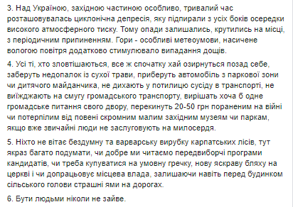 Сильные продолжительные дожди в горных районах - всегда несчастье. Природа не вечно может задерживать опасные процессы, независимо от лесистости. Дожди льют, с небольшими перерывами, месяц. Паводки, наводнения, к сожалению, явление для этих районов типичное" - написала она и привела в пример паводки 1969 года, 1970 года, когда в Тячеве прорвало дамбу и погибли люди.