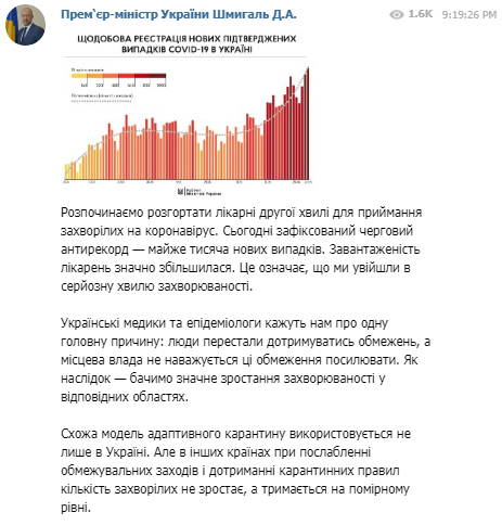 "Начинаем разворачивать больницы второй волны для приема больных с коронавирусом. Сегодня зафиксирован очередной антирекорд - почти тысяча новых случаев. Загруженность больниц значительно увеличилось. Это значит, что мы вошли в серьезную волну заболеваемости", - заявил Шмыгаль.