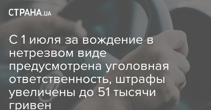 Со среды, 1 июля, в Украине ужесточат меры наказания для водителей в нетрезвом виде. За вождение в состоянии алкогольного опьянения вводят уголовную ответственность. Также увеличились штрафы до 51 тысяч гривен с лишением права управления транспортными средствами на срок от двух до трех лет.