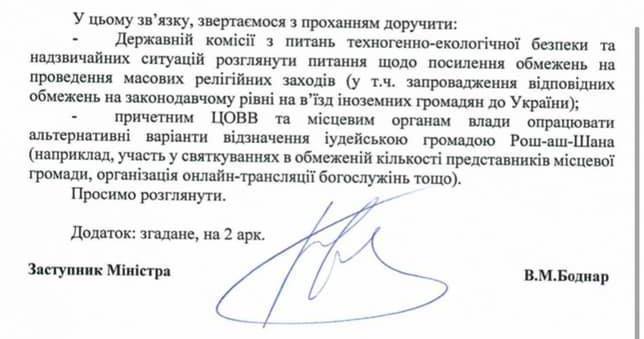 В прикрепленном к посту документе от 10 июля сообщается, что во время совещания 10 июля обсуждался вопрос традиционного паломничества хасидов в Умань на иудейский праздник Рош-ха-Шана в условиях коронавируса.