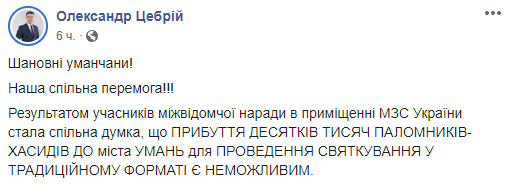"Уважаемые жители Умани! Наша общая победа!" - прокомментировал он решение министерства.