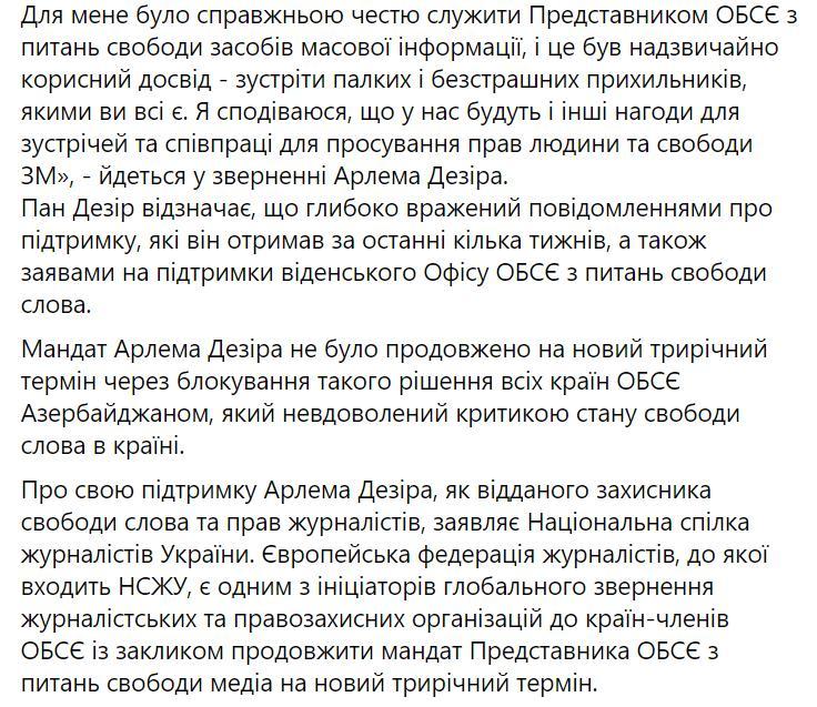 Мандат Арлема Дезира не был продлен на новый трехлетний срок из-за блокирования такого решения всех стран ОБСЕ Азербайджаном, который недоволен критикой состояния свободы слова в стране.