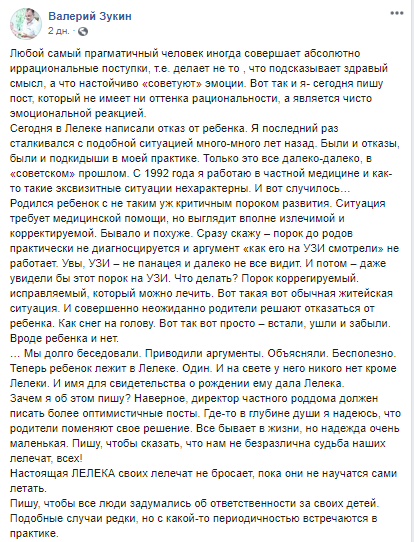 Зачем я об этом пишу? Наверное, директор частного роддома должен писать более оптимистичные посты. Где-то в глубине души я надеюсь, что родители поменяют свое решение. Все бывает в жизни, но надежда очень маленькая", - написал Валерий Зукин.