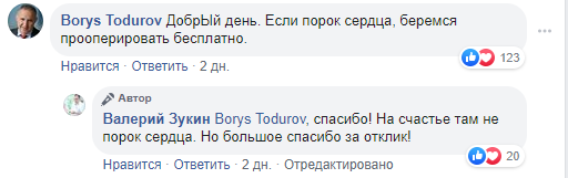 В комментариях к посту директор Института сердца Борис Тодуров написал, что готов сделать операцию бесплатно, если это речь о пороке сердца, но Валерий Зукин, ответил, что, к счастью, это не порок сердца.