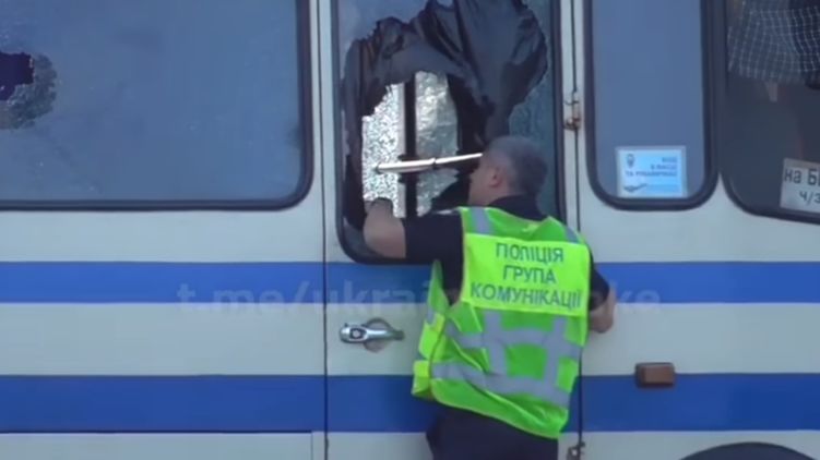 После долгих переговоров, в один из моментов к автобусу подошел первый замглавы Нацполиции Украины Евгений Коваль и передал воду для заложников. И практически сразу из салона раздался выстрел и пуля прошла над головой офицера полиции.