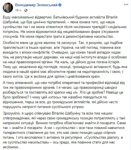 "Буду очень откровенным. Родительский дом активиста Виталия Шабунина, который был цинично подожжен, - явный признак того, что наше общество не может прийти в себя после многочисленных трагедий и социальных потрясений. Не может отказаться от нецивилизованных форм выяснения отношений. Не может перестать играть в демонстративное насилие", - говорится в сообщении президента. То есть он придерживается версии о поджоге.