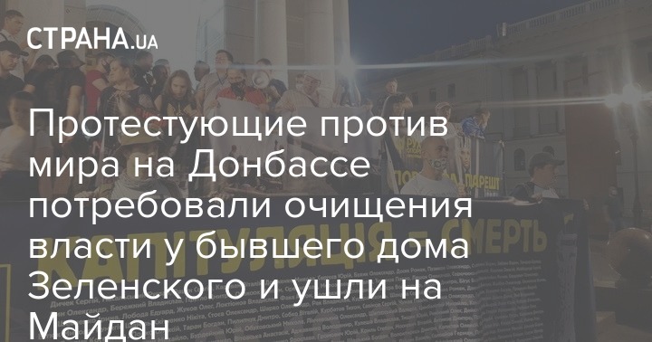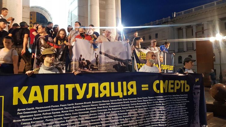 В Киеве подходит к концу акция протеста против перемирия на Донбассе, организованиия партией "Европейская солидарность". Ее участники, митинговавшие на Банковой, пришли под дом, где раньше жил Владимир Зеленский.