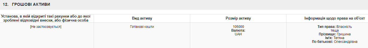 В декларации за 2019 год в разделе "Финансовые обязательства" указано, что в 2017 году он занял деньги у тещи Татьяны Гришиной - 279 330 грн, а в 2019 году занял у нее же 198 552 грн.