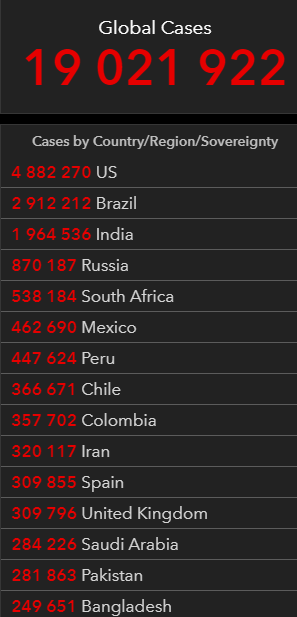 По последним данным (по состоянию на 06.55, 7 августа - Ред.), всего в настоящий момент на планете зафиксировано 19 021 922 случая заражения, умерло уже 713 813 пациентов.