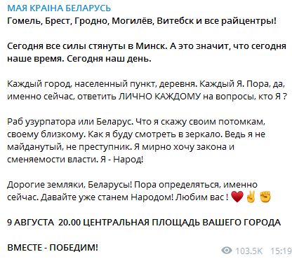 17:52 Белорусские оппозиционные телеграм-каналы призывают людей в 20-00 сразу после окончания голосования выходить на главные площади своих городов.