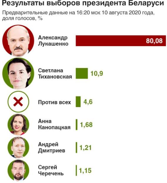 9:07 В голосовании на выборах президента Белоруссии приняли участие 5 млн 790 тысяч человек, явка составила 84,23%. Лукашенко по предварительным итогам набирает 80,23% голосов, Тихановская - 9,9%, сообщила глава ЦИК Белоруссии во время пресс-конференции.