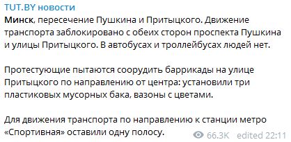 22:36 Некоторые Телеграм-каналы пишут, что на Пушкинской в Минске начался силовой разгон.