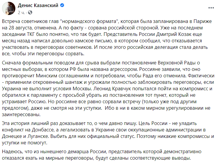При этом оба фактора не могли стать главной причиной срыва встречи - о них было известно и раньше. Тем более, что встречи советников - это не саммит лидеров государств. Казанский пишет, что россияне сорвали встречу "под другим предлогом", не называя - под каким именно.