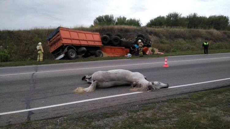 В россии от столкновения с лошадью перевернулся Камаз. Фото: ГИБДД Железногорска