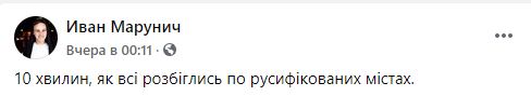 "Попытка создать свой мэм похвальна. Вот только не было никогда никаких "русифікованих міст". Русификация предусматривает, что кто-то пришел и кого-то русифицировал, навязал русский язык. Однако все крупные украинские города изначально были русскоязычными. Более того, переписи начала ХХ века показывают, что украинцы в них составляли меньшинство. Частично украинизировали города как раз большевистская украинизация и Вторая мировая война", - написал он.