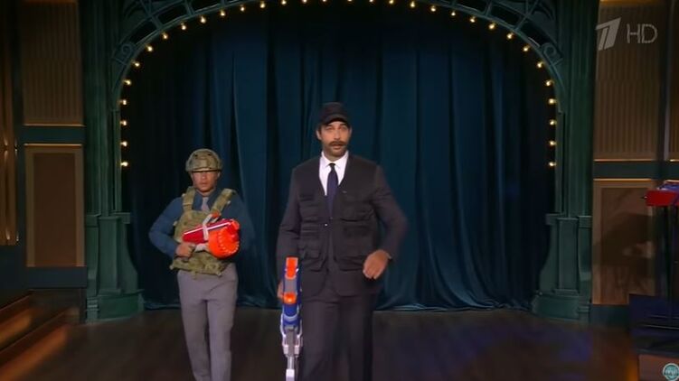 Ургант и Хрусталев выходит в студию с игрушечными автоматами, по дороге здоровается с сотрудниками. На Урганте кепка и усы как в Лукашенко, Хрусталев одет в каску и бронежилет. По дороге он произносит те же слова, что и Лукашенко на том самом видео.
