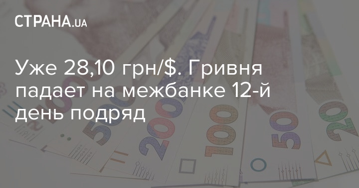 Во вторник, курс гривни на межбанковском валютном рынке упал 12-й день подряд, достигнув 28,105 грн/$1 с 27,990 грн/$1 в предыдущий рабочий день